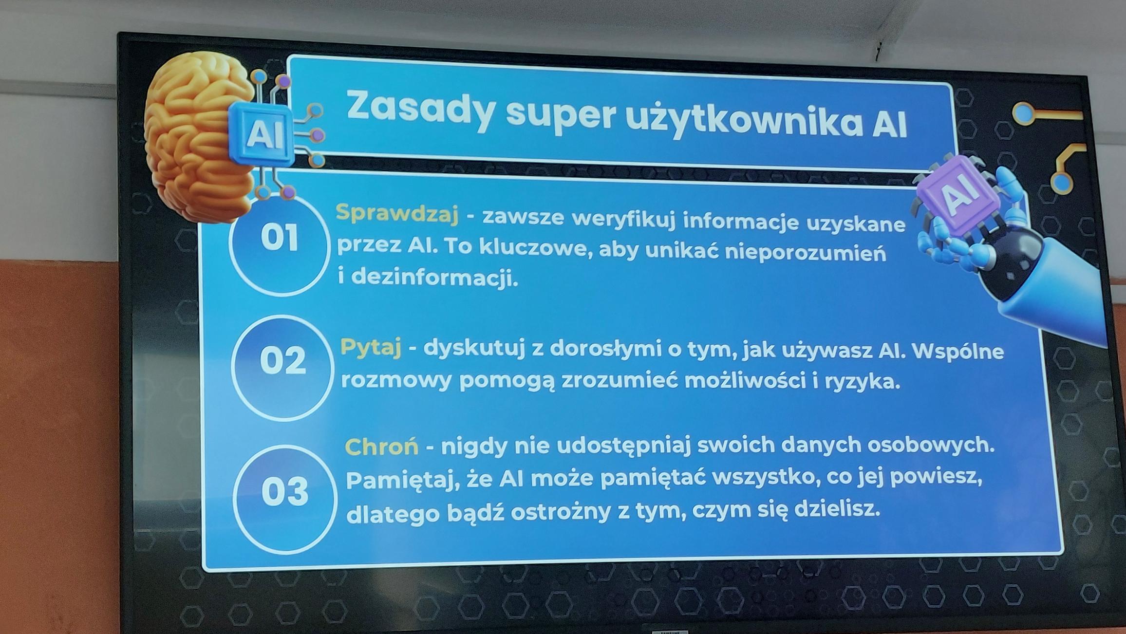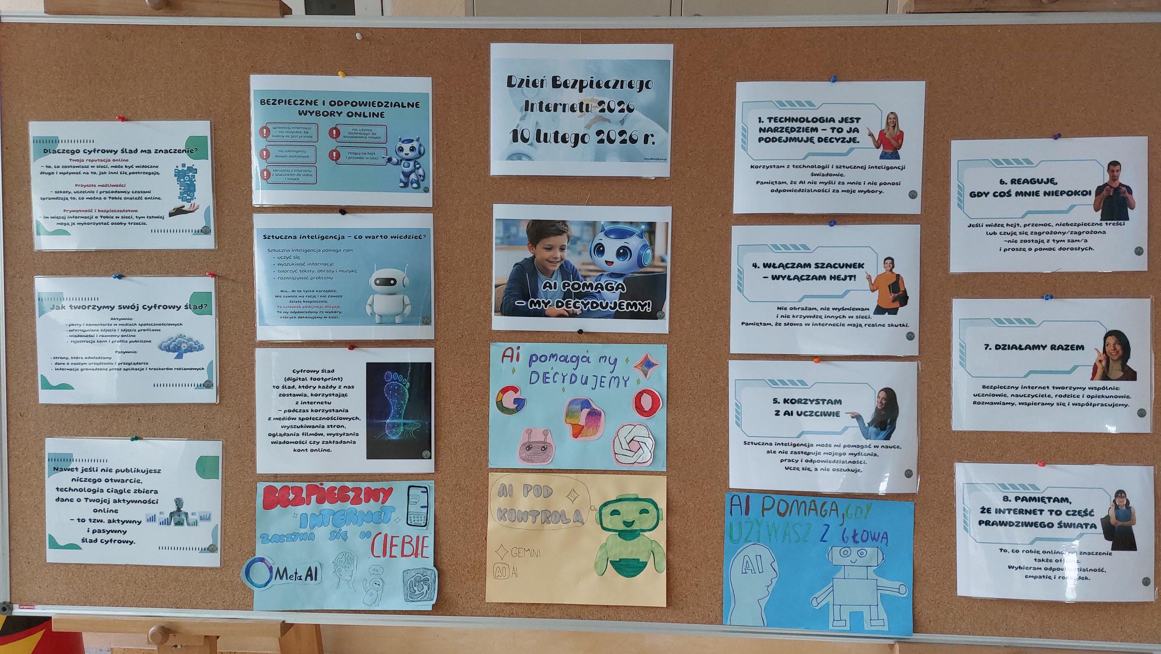 11 lutego w naszej szkole obchodziliśmy “Dzień Bezpiecznego Internetu” pod hasłami “Działajmy razem” oraz „Inteligentna technologia, bezpieczne wybory – odkrywanie bezpiecznego i odpowiedzialnego korzystania ze sztucznej inteligencji”, które podkreślają, że bezpieczeństwo w sieci jest wspólną odpowiedzialnością uczniów, nauczycieli i rodziców. Obchody rozpoczęły się audycją szkolną, w której poruszono temat ochrony danych osobowych, kultury wypowiedzi w sieci oraz reagowania na hejt. Podkreślono, że w sytuacjach trudnych nie wolno pozostawać obojętnym – warto szukać pomocy i wspierać innych. Na korytarzu szkolnym pojawiła się prezentacja multimedialna, która w przystępny sposób przypomniała zasady bezpiecznego korzystania ze sztucznej inteligencji. W klasach młodszych podczas zajęć uczniowie rozmawiali o tym, jak dbać o swoje bezpieczeństwo w Internecie, a następnie wykonali “zegarki bezpieczeństwa”, na których umieszczone zostały najważniejsze zasady obowiązujące podczas korzystania z sieci. Korytarze szkolne ozdobiły prace plastyczne wykonane przez uczniów klas starszych podczas zajęć “Jak bezpiecznie korzystać z AI”.