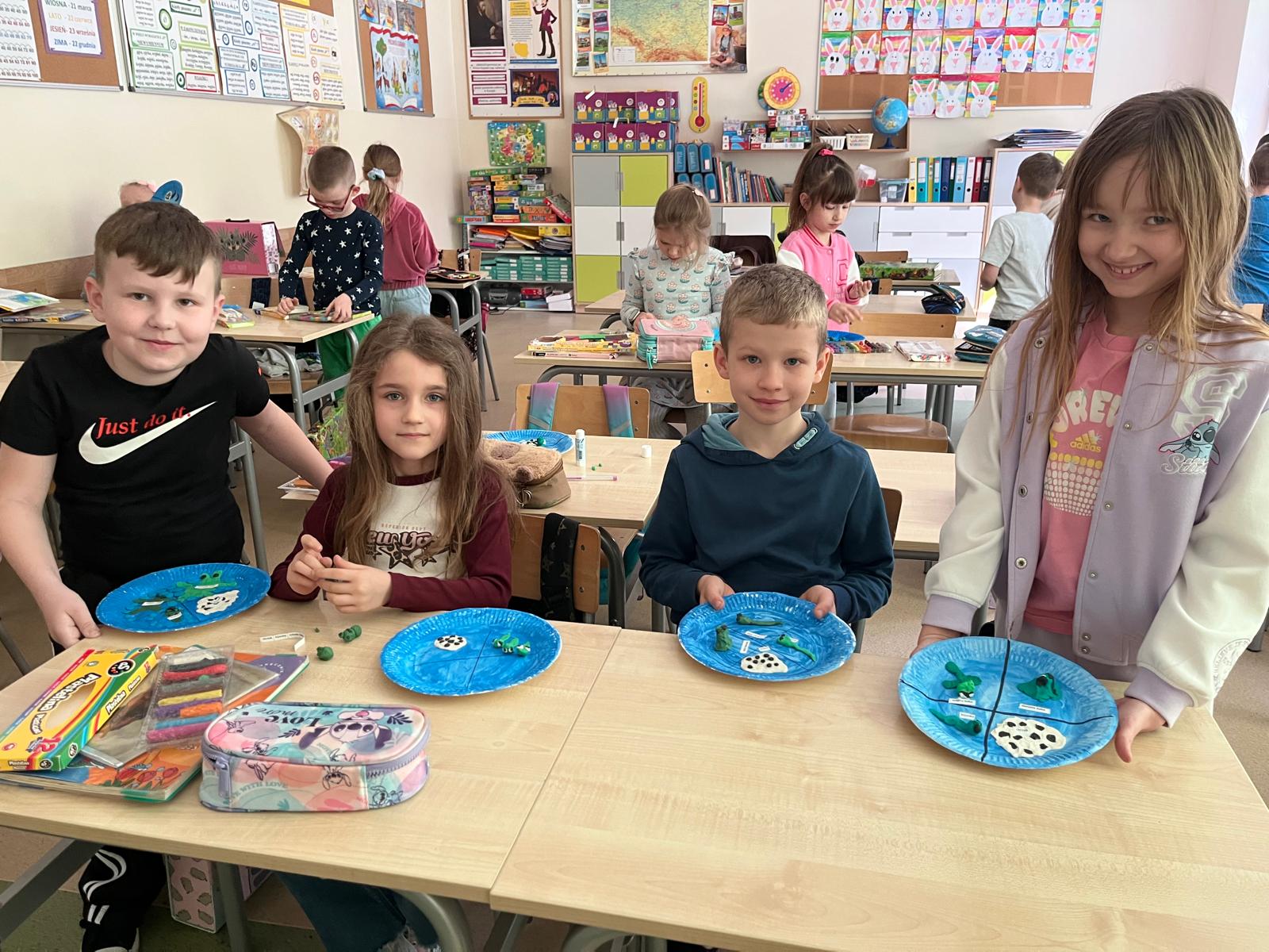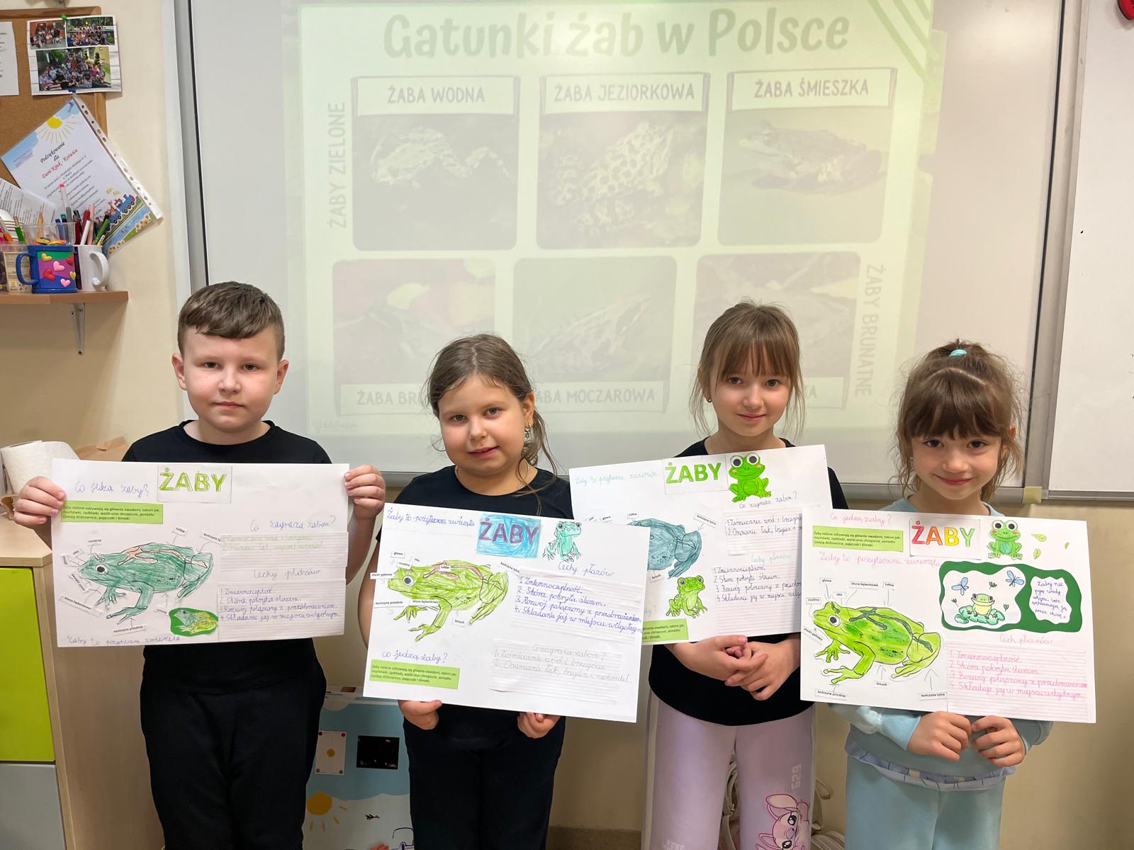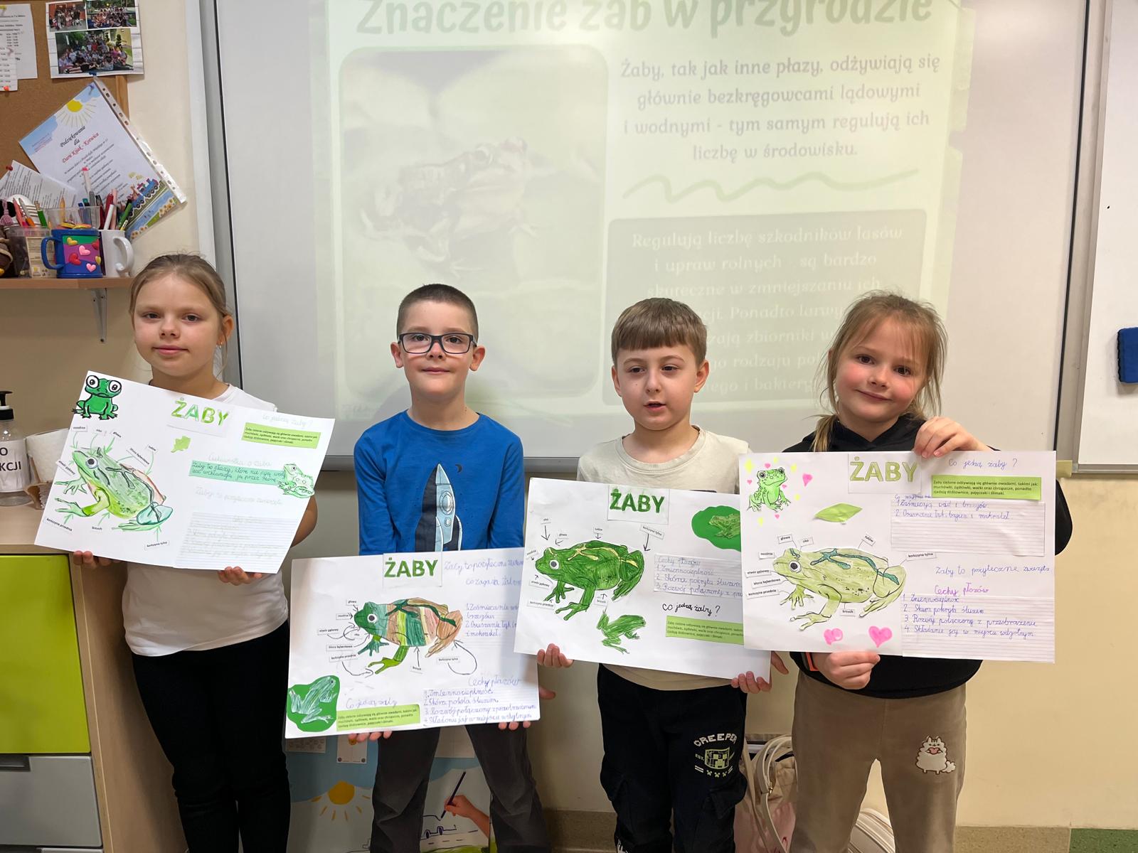 W pierwszym tygodniu wiosny uczniowie klasy „I a” realizowali na lekcjach projekt przyrodniczy poświęcony żabom. Dzieci przygotowały makiety prezentujące cykl rozwojowy żaby oraz plakaty z opisem budowy tych płazów i ważnymi funkcjami jakie pełnią w środowisku. Metamorfoza, od kijanki do zielonej żabki, zrobiła na dzieciach ogromne wrażenie i rozbudziła ciekawość przyrodniczą. Jeszcze tyle do odkrycia przed nami!