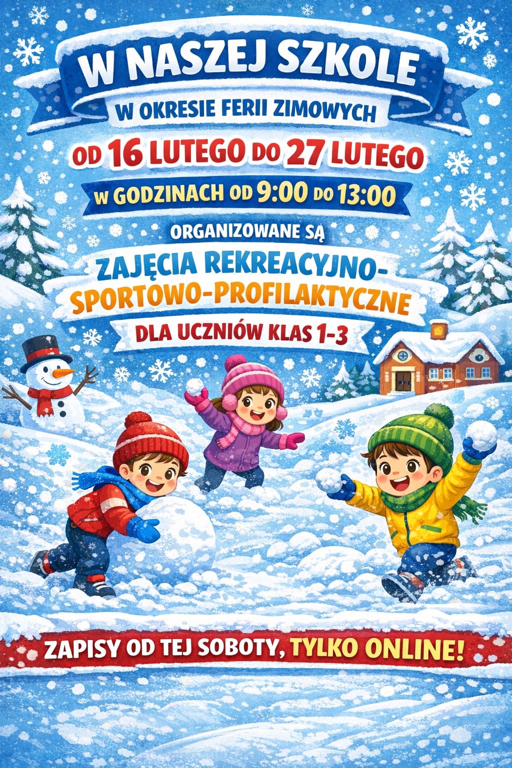W okresie ferii zimowych tj. od 16.02.2026 do 27.02.2026 w dni robocze w godz. od 9.00 do 13.00 dla uczniów klas I-III w naszej szkole organizowane będą zajęcia sportowo-rekreacyjne w ramach półkolonii 'Zima w mieście 2026r’. Zapisy na półkolonie od dnia 24 stycznia 2026r. godz. 9.00. do 26 stycznia 2026r. do godz. 10.00. Link do formularza: