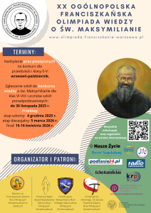 Zapraszamy Was do udziału w Ogólnopolskiej Olimpiadzie Franciszkańskiej. Waszym zadaniem jest przygotowanie pracy plastycznej związanej z osobą św. Maksymiliana Kolbego. Tematem przewodnim konkursu jest: „Patriotyzm u małego Mundka”. Prace wykonujecie korzystając ze specjalnie przygotowanego tekstu, który jest dostępny na stronie szkoły. Najlepsze prace zostaną nagrodzone i trafią do etapu ogólnopolskiego.