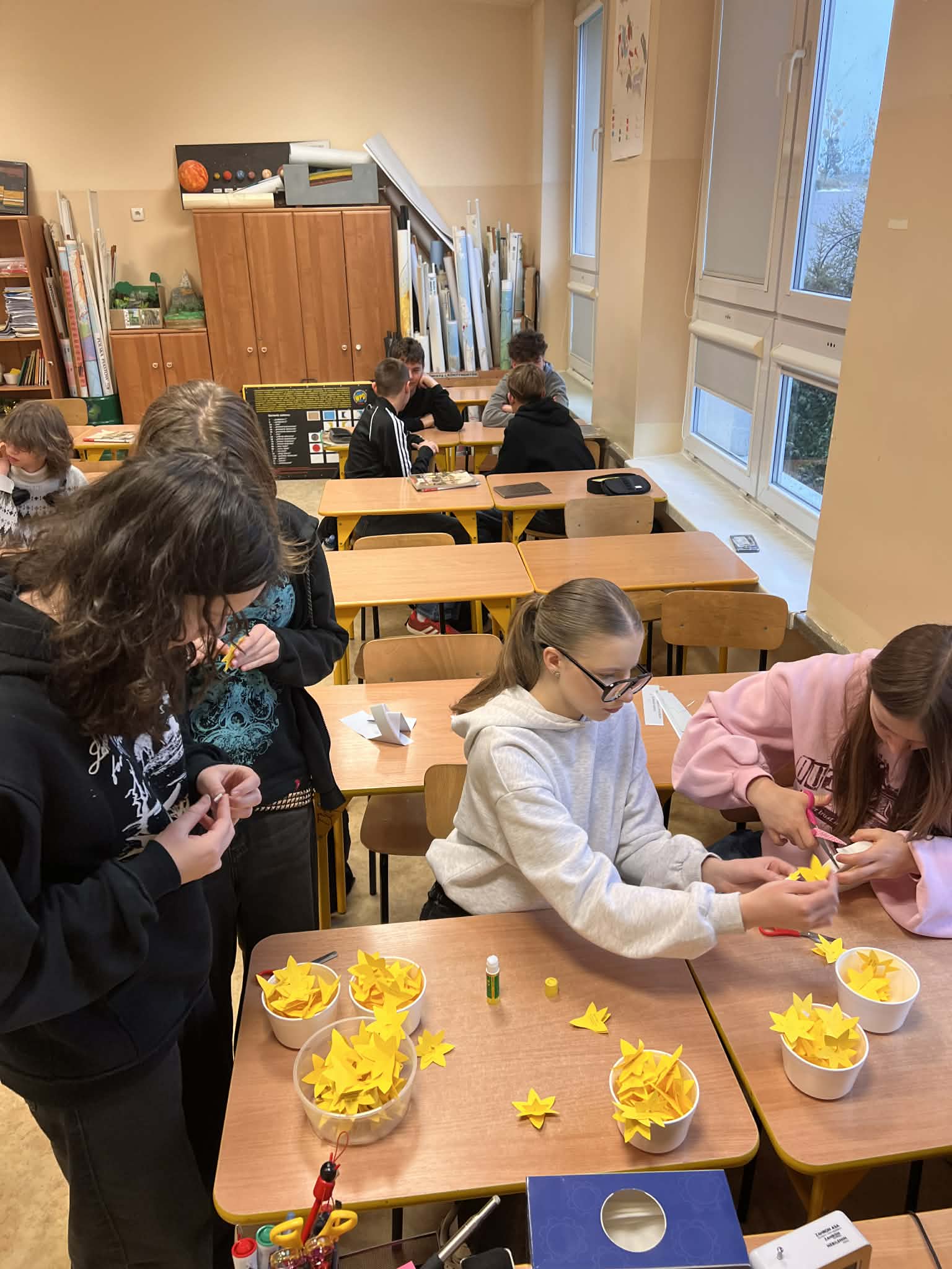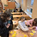 Podczas zajęć dzieci ze świetlicy klas 1 z dużym zaangażowaniem tworzyły piękne, kolorowe wieńce z bibuły. Była to praca kilkuetapowa, wymagająca cierpliwości i precyzji – od przygotowania elementów, przez ich łączenie, aż po końcowe dekorowanie.
